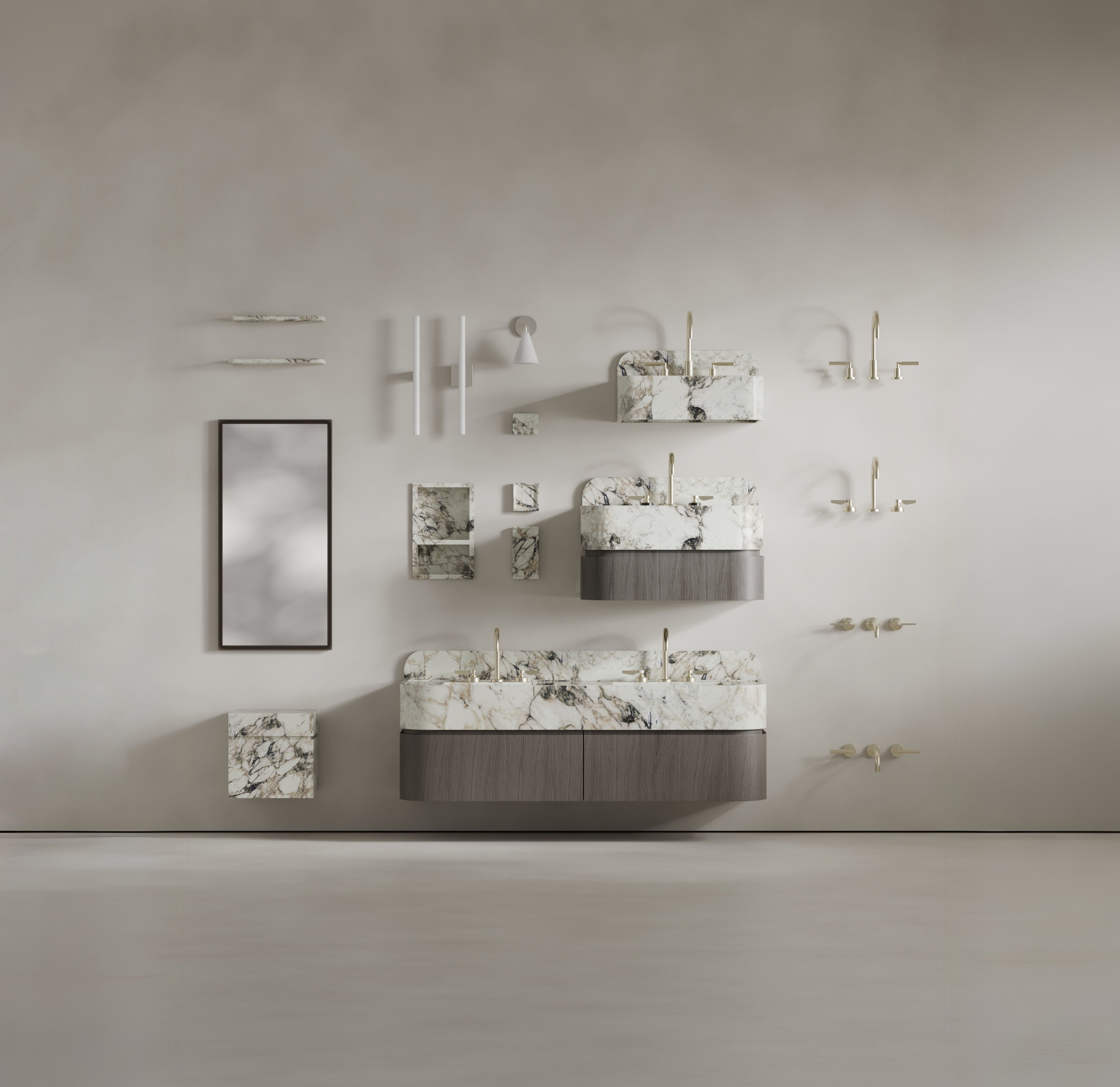 Centerpieces aus Marmor, kombiniert mit sorgfältig kuratierten Elementen – für ein Badezimmer, das Ruhe, Eleganz und Atmosphäre ausstrahlt.